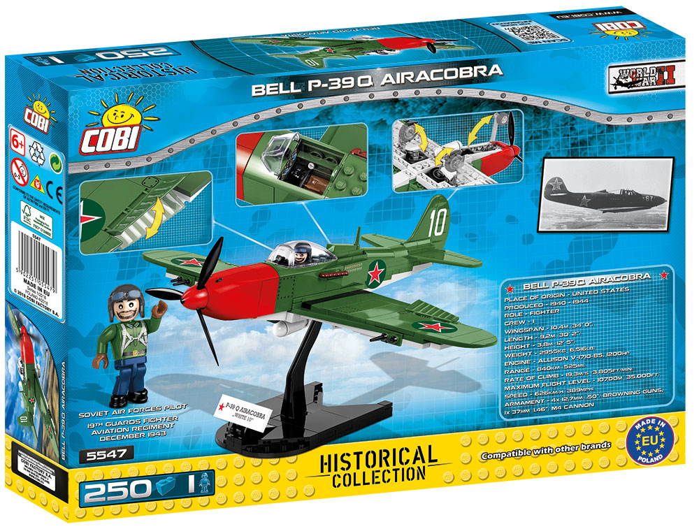 The Bell P-39Q Airacobra constriction block by COBI was manufactured to 1:35 scale with attention to the smallest details. It has many movable elements such as ailerons on the wings, propeller and wheels that rotate and can be hidden or pulled out of the chassis. The pilot's cabin can be opened to put a figurine at the controls. This model utilizes a new type of chair, developed by COBI, which allows you to attach the figure to it in such a way that the pilot will remain stationary. The set is also equipped with a special stand which will enable the plane to be displayed attractively and includes a plate with the printed name of the plane. The box also has an invitation code for new players in World of Warplanes.
