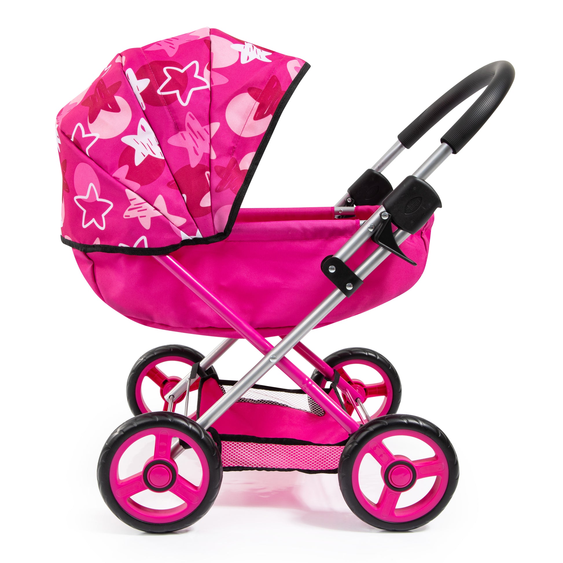 The doll's pram COSY has a lovely design and with its blanket and matching pillow the doll can fall in sweet dreams. The doll’s pram is suitable for dolls up to 46 cm. The bicolored frame with the modern color matching wheels as well as the adorable sun hood give COSY its fantastic look. The integrated basket and the shoulder bag offer a lot storage space for everything needed for a trip with the favourite doll. Thanks to the big wheels, the doll’s pram COSY can be driven easily on uneven areas.