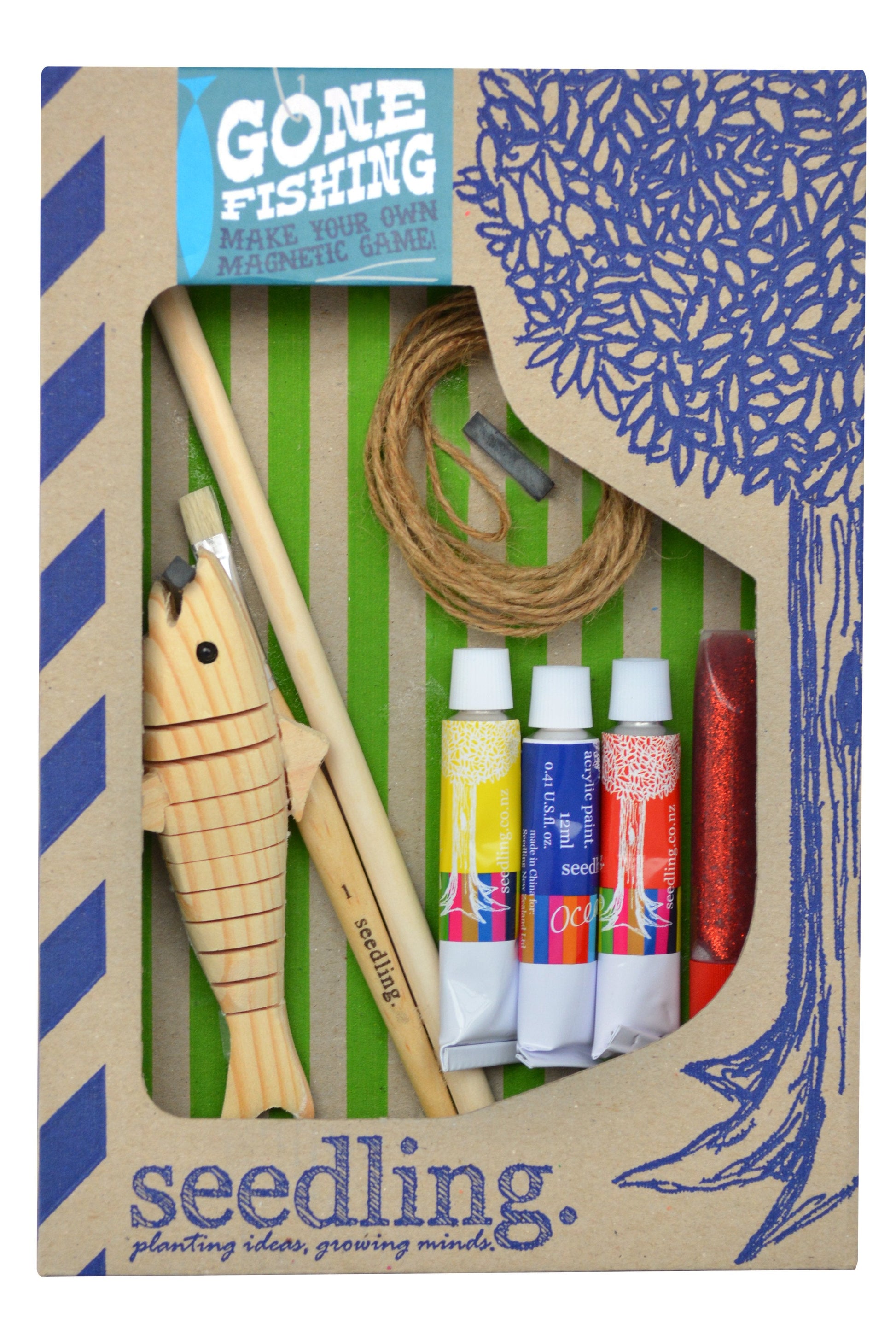 Get hooked on fun with this one-of-a-kind fishing kit! This DIY kit includes everything you need to design your own finned pal and create your own magnetic fishing game, including artist-quality acrylic paint, glitter, and a wooden fish and pole.