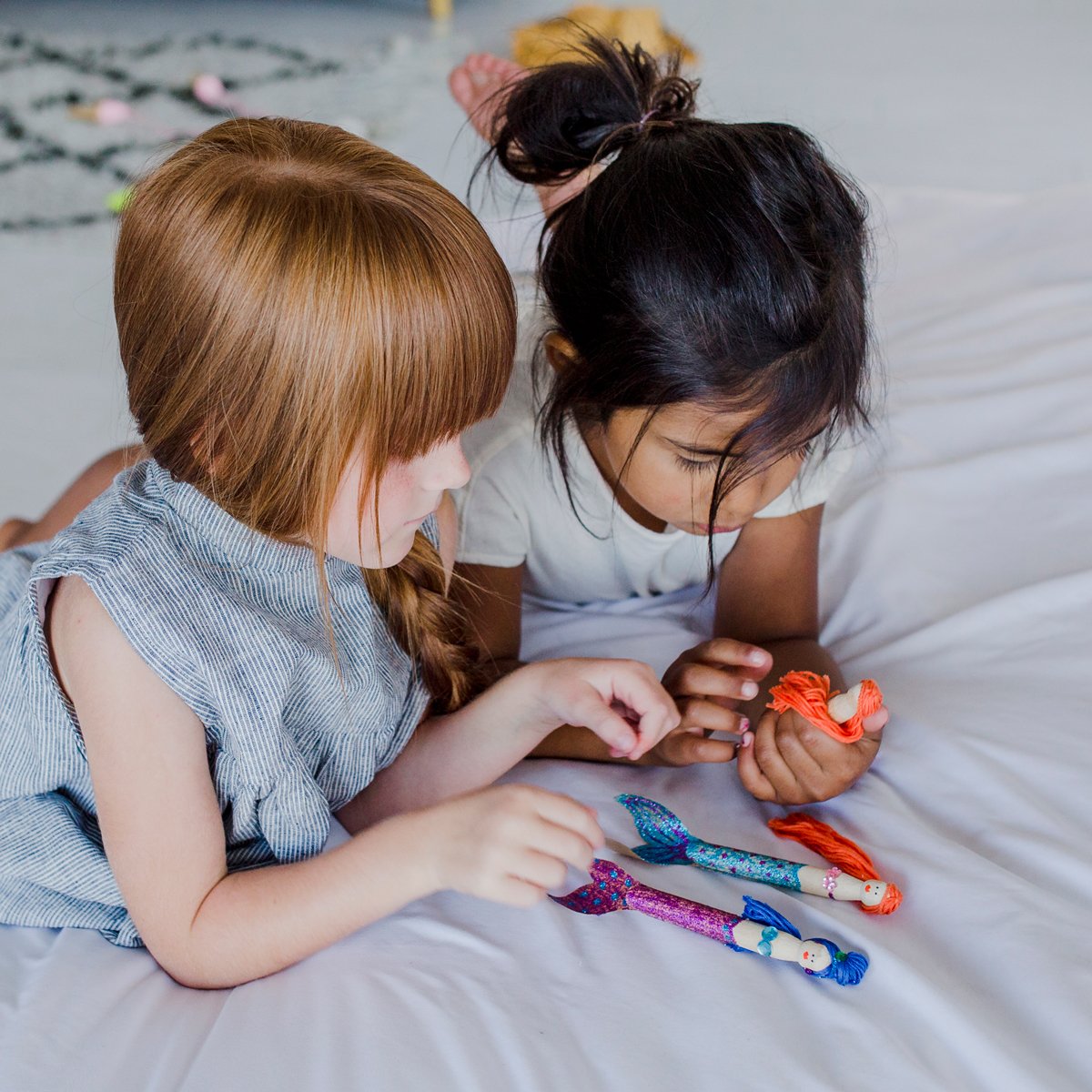 Imagine our own exciting sea adventures with your own mermaid friends. This award-winning DIY kit comes with everything you need to design and dress a pair of adorable ocean pals, including a two wooden peg dolls, sparkly rhinestones, glitter glue, pre-cut mermaid tails, and more!
