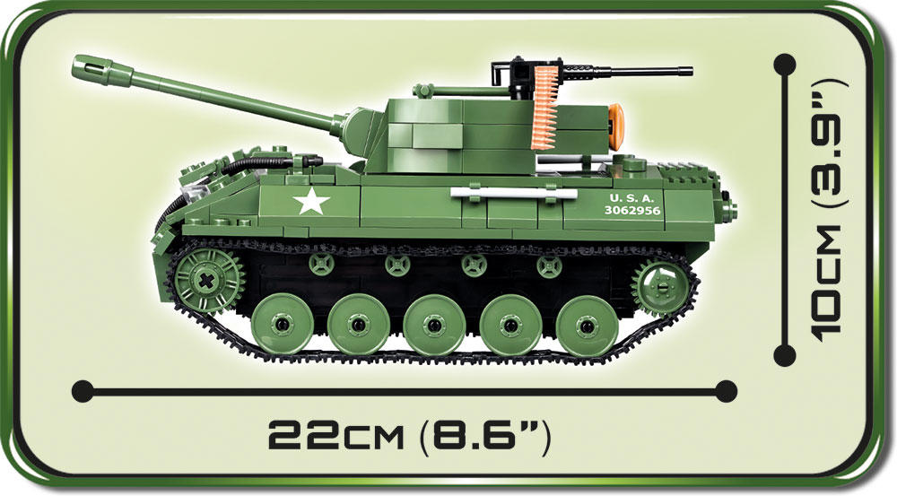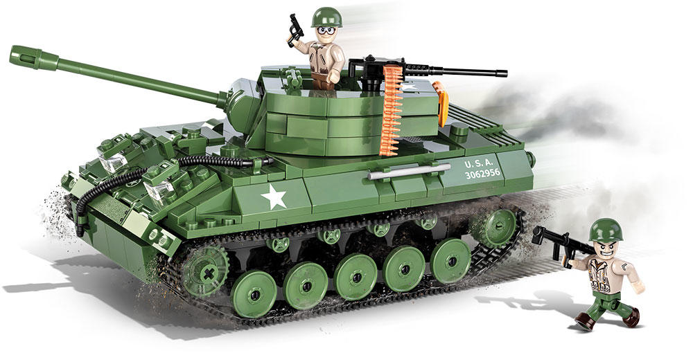 This new model from COBI is a perfect replication of this historic tank. The block model consists of movable wheels, rotating turret and rotating heavy machine gun equipped with an ammunition pack and hatches that can be opened. The set also has two figures of American soldiers: the commander armed with an automatic pistol MI9II and a foot soldier with a rocket launcher M1 Bazooka, a spade, a hatcher and a hammer. In addition, a special playing card with vehicle statistics can be found inside.