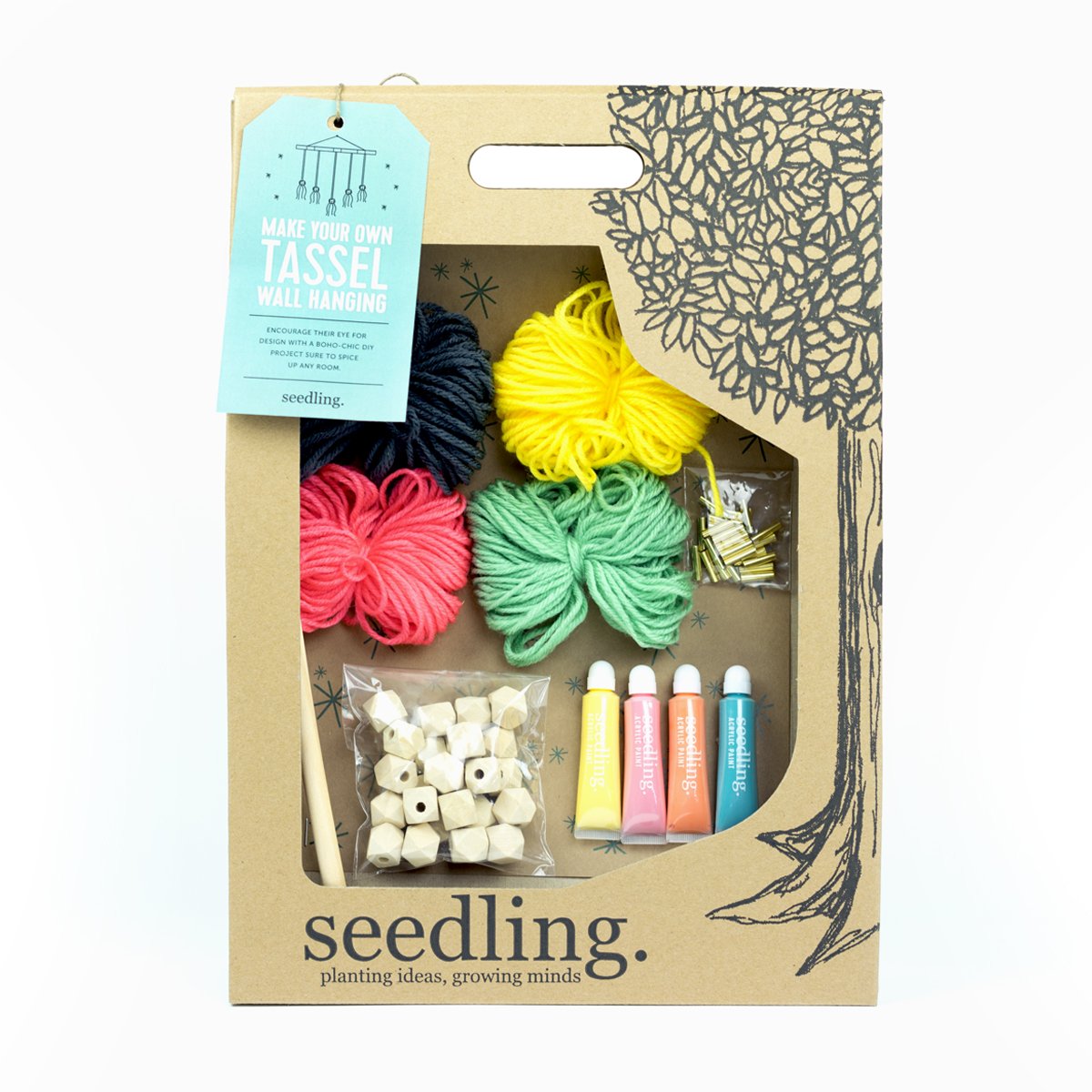 Enhance your eye for design! This easy to make DIY kit features brightly colored yarn to make tassels, 4 shades of paint, and geometric shaped beads. Make, create, and hang it proudly. Your custom-made work of art will add an element of boho-chic to any room in the house.