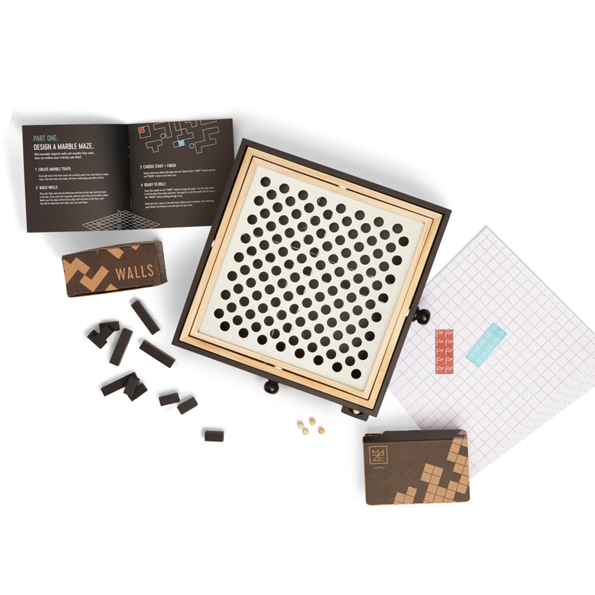 Start by designing your own maze. Build pathways with the walls, punch holes in the floor card to create traps, set start and finish points, then place the wooden marble into your maze to play. With magnetic walls and extra floor cards, there are endless ways to redesign and play your Maze.