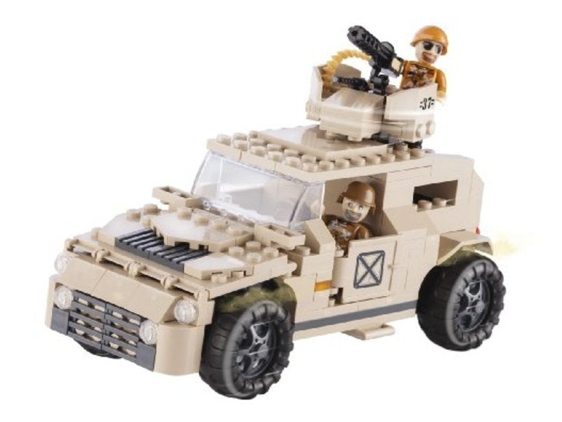 The set includes 200 pieces and 2 figures plus accessories.It features a heavy military vehicle model with a driver up front and one machine gun nest on the roof, operated by a soldier.