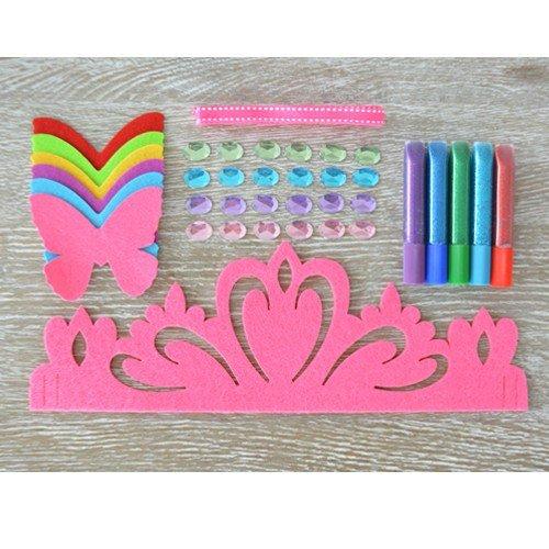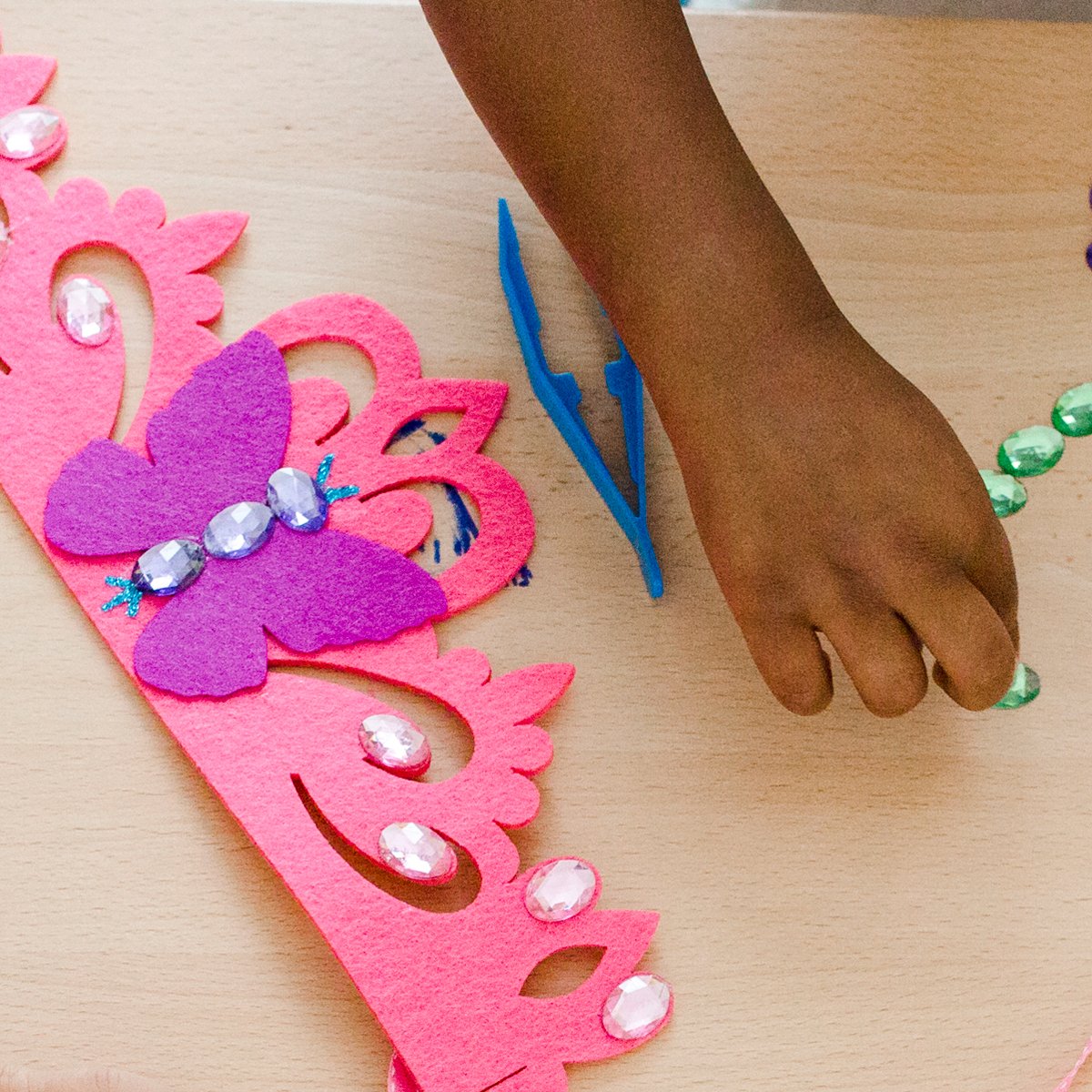 Look majestic with your very own custom princess crown. Let your royal self shine with this beautiful headpiece adorned on your head. Our DIY kit comes with pre-cut felt butterflies, colorful gemstones, and ribbon to design your own sparkly creation.